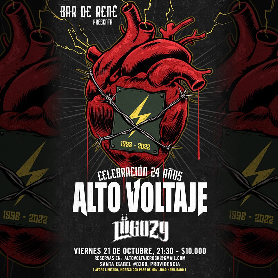 El próximo viernes 21 de octubre a partir de las 21.30 hrs., la legendaria banda Alto Voltaje celebrará sus 24 años de trayectoria, junto a Lügozy, en Bar de René, ubicado en Santa Isabel 0369. Providencia.